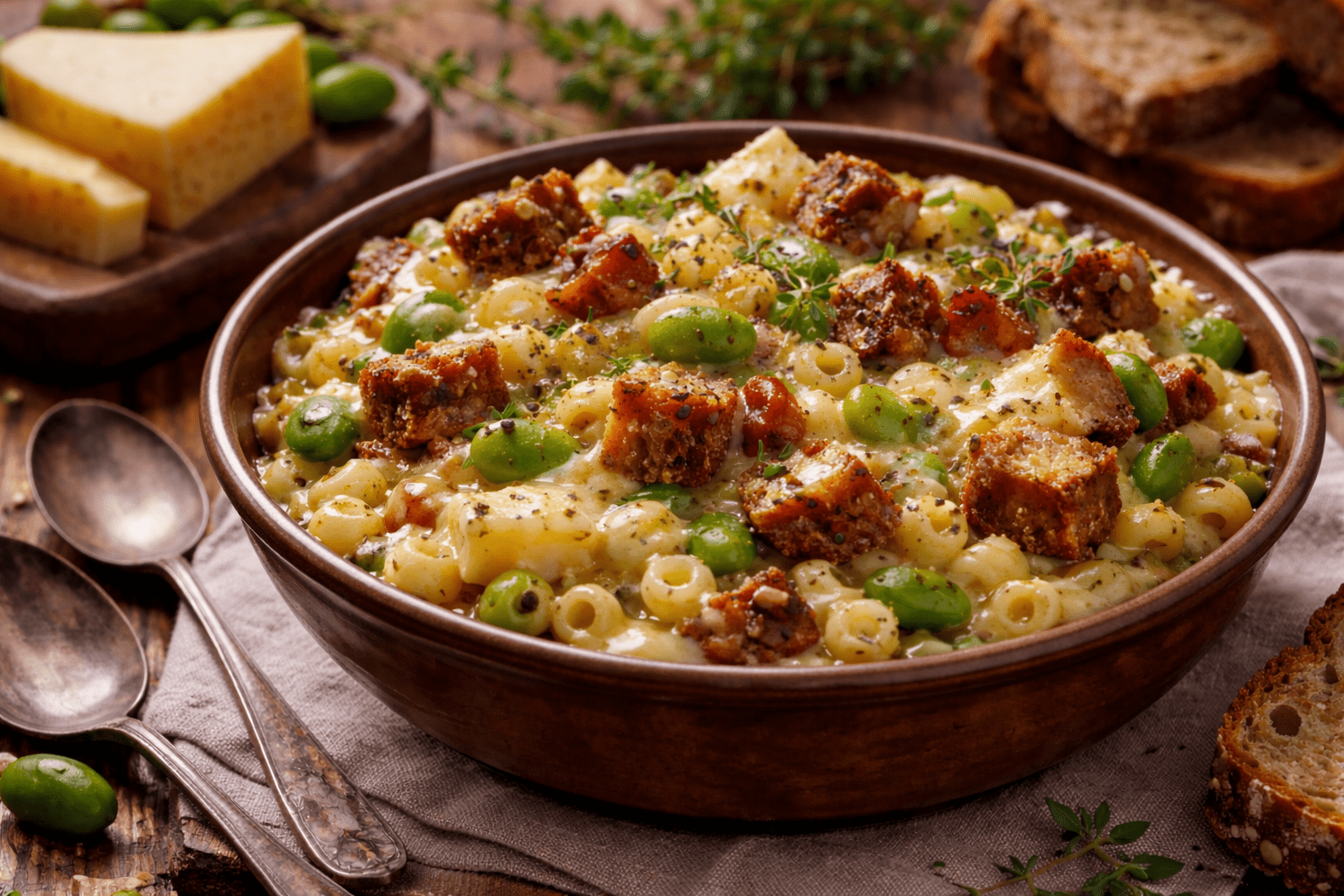 La pasta con le fave e il formaggio deve ancora essere trasferita nella padella e mantecata brevemente sul fuoco, per ottenere una consistenza cremosa e avvolgente. In alternativa, è possibile trasferirla all’interno di cocotte monoporzione e ripassarle brevemente in forno con grill per circa una decina di minuti a 150 gradi per fare sì che assuma una leggera gratinatura.