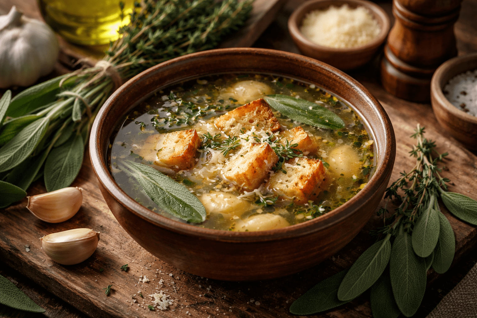 Cette soupe légère peut être agrémentée d’herbes aromatiques et spontanées typiques de la Provence, dont la sauge (10 grammes) et le thym (10 grammes) ainsi que d’un filet d’huile d’olive extra vierge (20 millilitres). Si on le souhaite, on peut également le servir directement sur l’assiette avec du gruyère râpé (100 grammes) et accompagné de croûtons de pain, également à l’ail, grillés au four.
