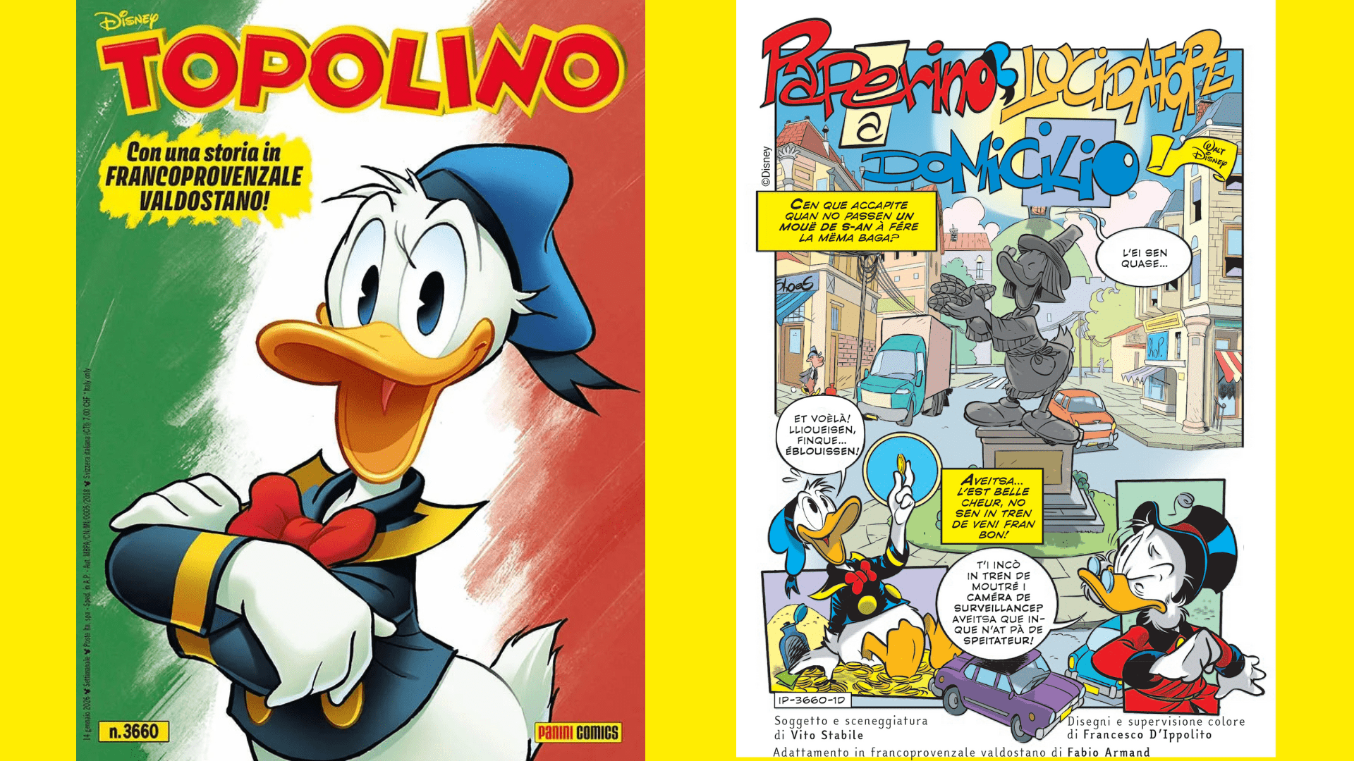 À l’occasion de la Journée nationale des dialectes et des langues régionales. l’hebdomadaire Mickey Mouse consacre une bande dessinée à la variété linguistique locale avec quatre versions en valdôtain, génois, bolognais et catanzaro. Dans le numéro 3660, une histoire inédite mettant en scène Donald Duck est proposée non seulement en italien mais aussi dans certaines variétés territoriales afin d’attirer l’attention sur la richesse linguistique de l’Italie à travers l’un de ses produits culturels les plus répandus.