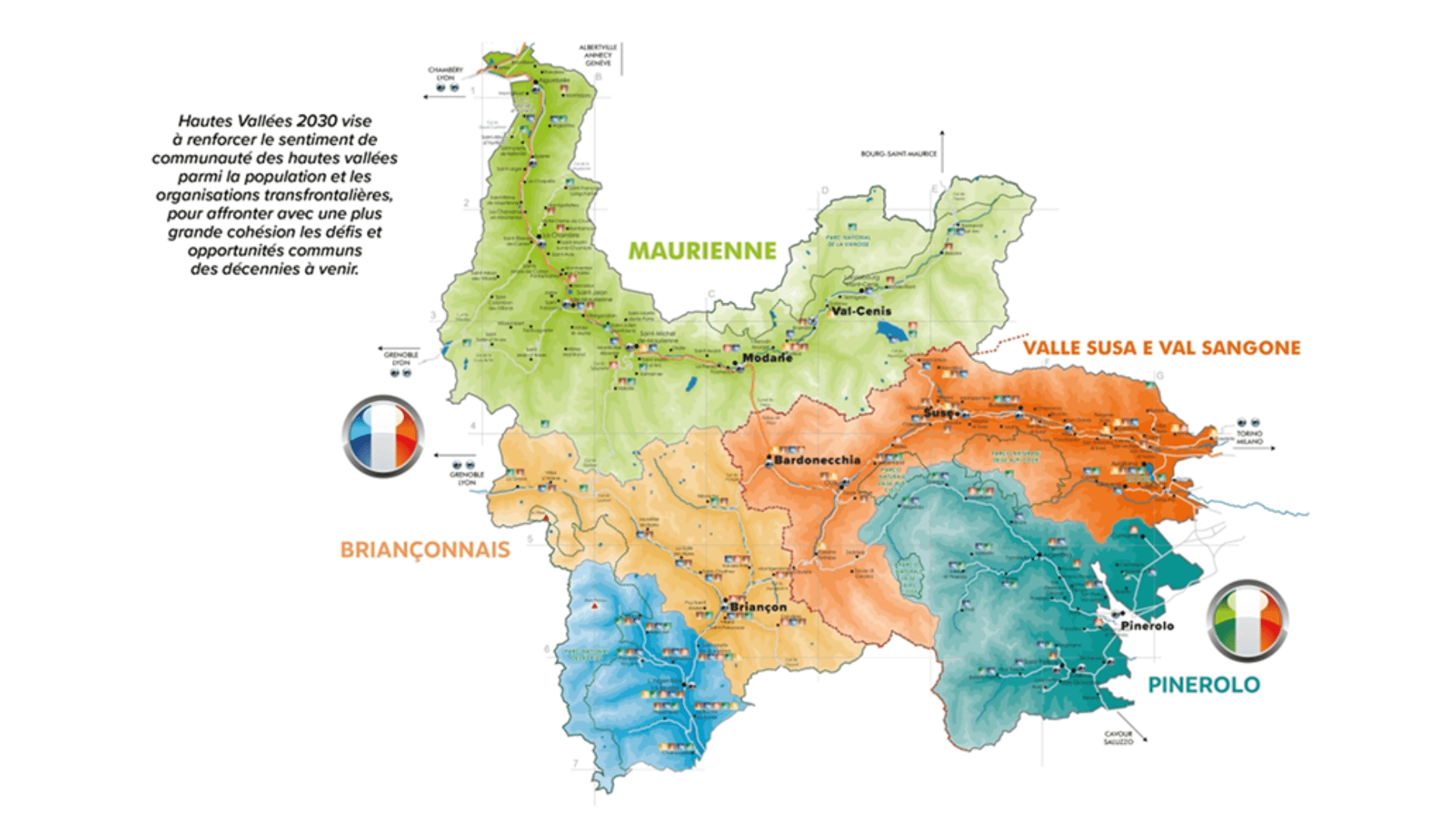 Les zones de montagne du Piémont occidental (Vallée de Suse et Pinerolo) et les zones de Haute-Maurienne Vanoise et Briançon renforcent leur coopération à travers une nouvelle phase de planification conjointe. Le plan territorial intégré « Hautes Vallées 2030 », soutenu par le programme Interreg Alcotra France-Italie 2021/2027, en est le cœur : il vise à répondre à des défis tels que le développement économique, la qualité de vie, l’accessibilité et l’attractivité touristique.